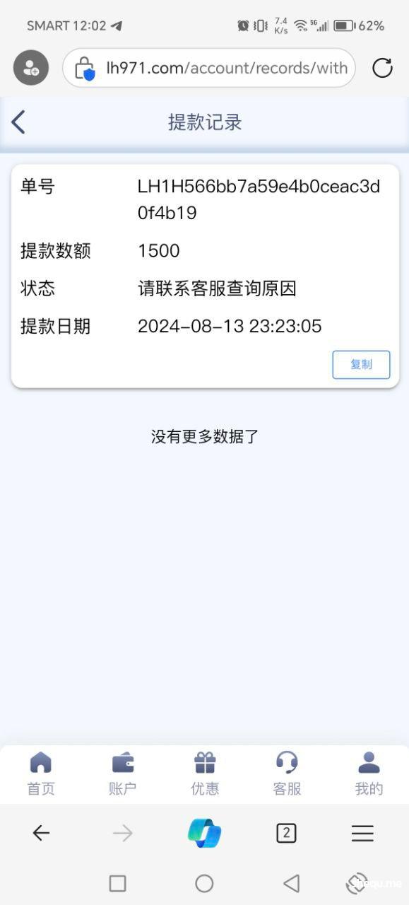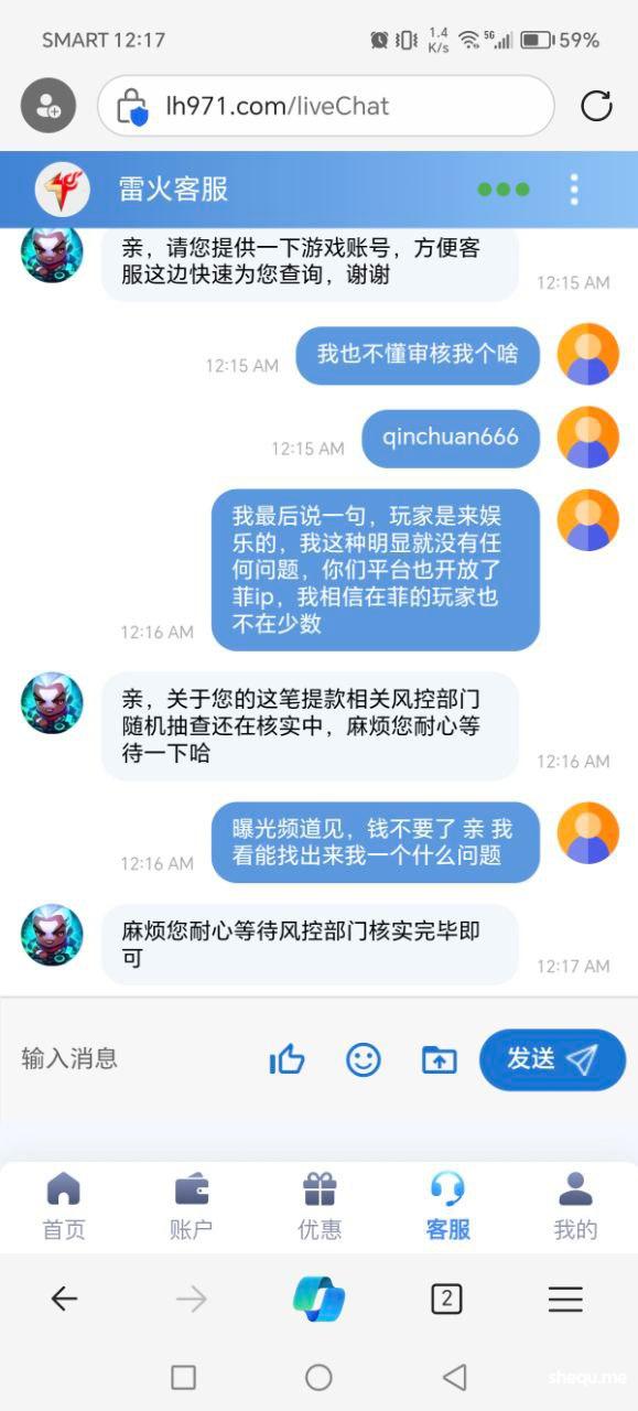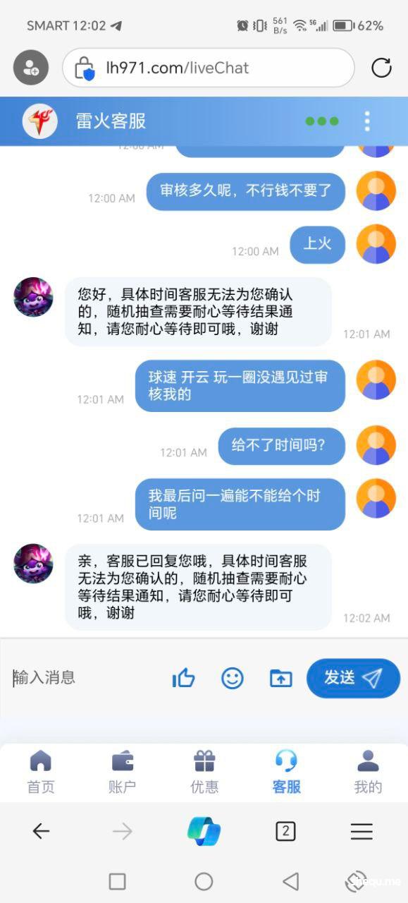 本人在菲做点小生意,唯一的爱好就是每天打点转转,今天经电报介绍去雷火平台, 充值300打麻2拉到1500提款半小时没到账去咨询客服,客服回复随机抽查请耐心等待结果!本人没领过任何彩金,也是第一次在雷火娱乐。赌友圈流行一句话,电子都卡的台子绝对是垃圾台子!本人在开云系列台,bm体育,球速体育等娱乐过很久,账号相同可查,重未发生过此类扎心的问题!忘广大网友远离黑平台,还网赌圈一份宁静,最后说一句,真的狠搞心态!