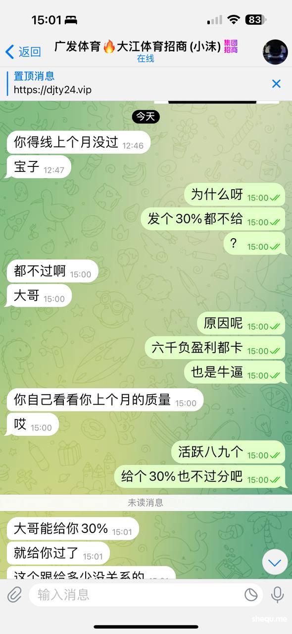 曝光大江体育黑佣金,本人代理号liuxiaomei1做大江体育已经三四个月了,前面每个月负盈利就三四万一般般,八月份因为事情忙没怎么发展负盈利就六千,但是活跃也够了,八个活跃,谁知道招商说佣金审核不通过。